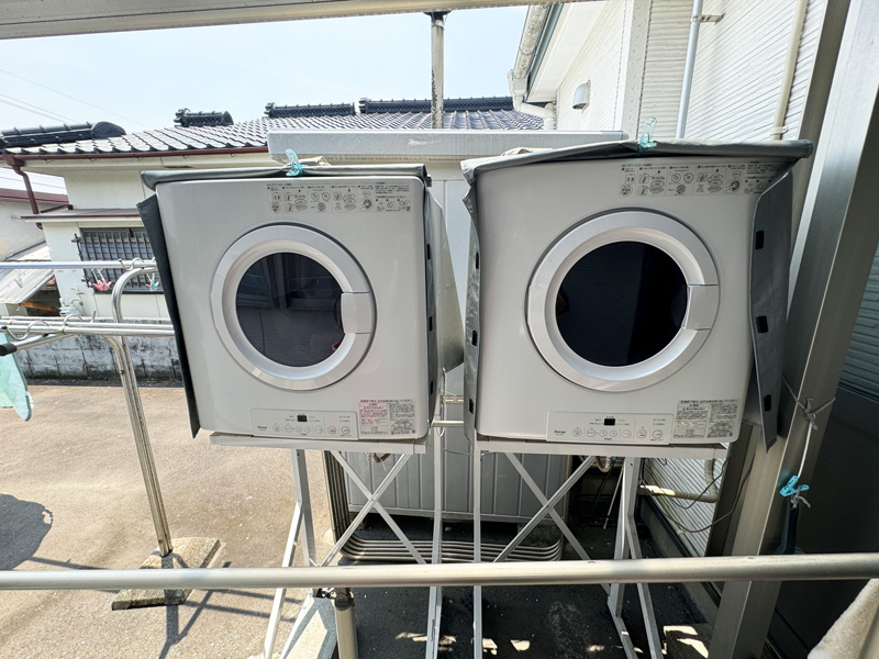 室外に衣類乾燥機2台を設置しています。洗ってすぐに乾かせるので、大変好評です。